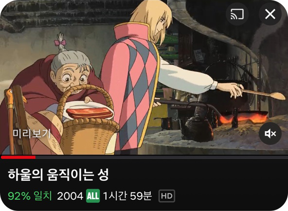 하울의 움직이는 성도 안 본 사람이 없을 만큼 대단한 인기인 영화 중 하나죠! 하울이 멋있기도 하고 귀여운 캘시퍼도 참 매력적인데요. 영상미부터 음악 그리고 스토리 모두 탄탄하게 잘 잡혀 있는 영화였고, 다시 봐도 질리지 않는 매력이 있어요! 지브리답게 여운이 잔잔하게 가는 것도 참 좋았어요.
