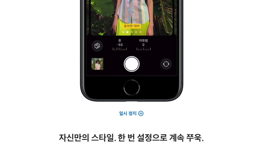 [사진 스타일]은 모든 사진에 자신이 원하는 느낌이 담길 수 있도록 해주는 기능이라고 합니다. 따뜻하게 혹은 차갑게처럼 마음에 드는 스타일을 선택한 후에는, 아이폰SE3가 알아서 하늘이나 피부 톤은 자연스러운 모습 그대로 유지하면서 조정이 필요한 부분에만 효과를 적용해줍니다.