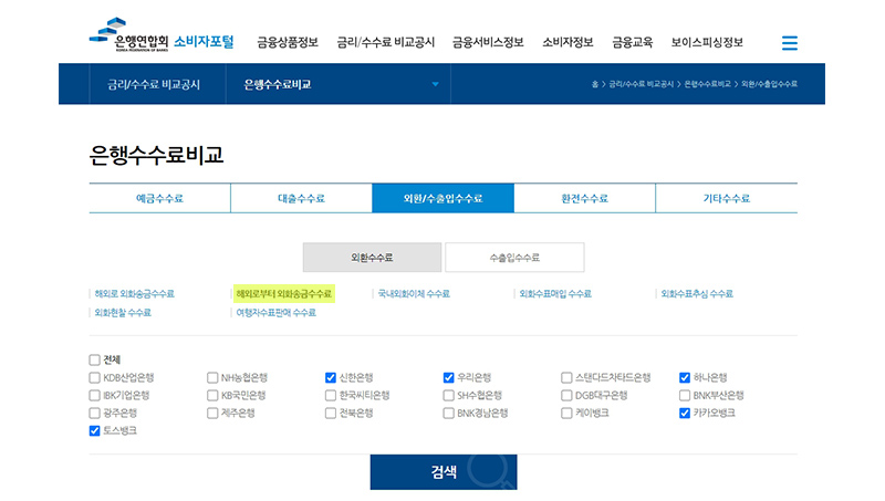 사이트에 접속 후 - 소비자포털 - 금리/수수료 비교공시 - 은행수수료비교 - 외환/수출입수수료를 클릭하면 화면이 하나 뜨는데요. 여기서 해외로부터 외화송금수수료를 클릭 후 본인이 원하는 은행을 선택하여 검색할 수 있어요.